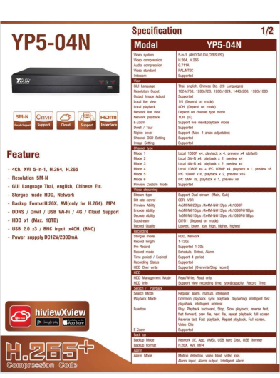 เครื่องบันทึก HIVIEW DVR รุ่น YP5-04N จำนวน 4 ช่อง